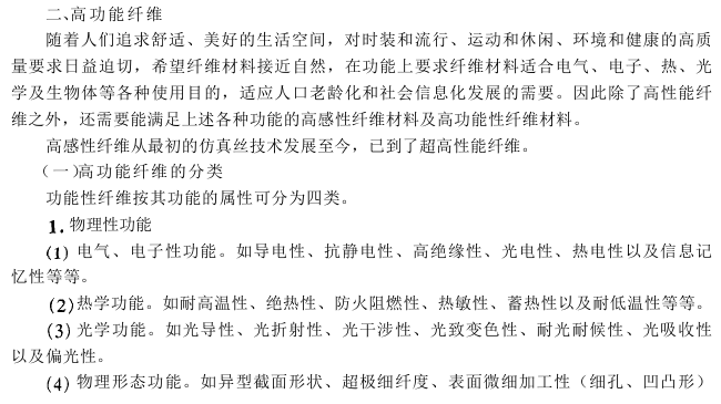 纤维与橡胶、塑料是高分子材料的三大形态,而纤维是高分子主要的用途之一,纤维不仅作为衣料,还在装饰、产业用纺织品方面有广泛的应用。