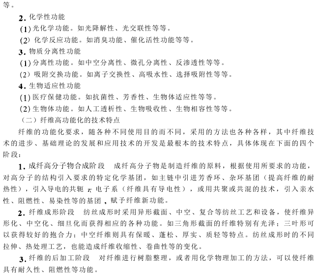 总之,高新产业的兴起和人们对高质量生活水平的追求,对高性能和功能性纤维的发展产生了巨大影响。高性能和高功能性纤维的开发及其加工技术正日益趋向更高的水平,更加复杂,并将与计算机和生物技术相结合。应用分子虚拟技术和基因工程,用化学的、物理的或复合的科学方法,控制纤维大分子链的高次构造,先从纤维的使用目的出发,预定所要求的纤维性能和功能,通过计算机进行大分子基团和结构的设计,确认佳组分和配比,然后进行高分子物的合成,选择合适的纺丝成形技术,制造出高性能或高功能性的纤维。这种先进的科研生产开发体系将是新世纪纤维产业的发展方向。