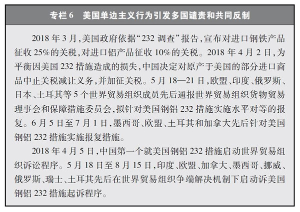 对多国产品开展“232调查”。美国政府滥用“国家安全”概念推行贸易保护措施。2017年4月,美国政府依据本国《1962年贸易扩展法》第232条款,以所谓“国家安全”为由对包括中国在内的全球主要经济体的钢铁和铝产品发起“232调查”,并依据单方面调查结果,于2018年3月宣布对进口钢铁和铝分别加征25%和10%的关税,招致各方普遍反对和报复。2018年4月5日,中国率先将美国钢铝232措施诉诸世界贸易组织。美国宣布自6月1日恢复对欧盟钢铝产品加征关税后,欧盟也予以反击并向世界贸易组织申诉,指责美国的措施违反世界贸易组织规则。欧盟贸易专员马姆斯特罗姆称,美国正在进行“危险游戏”,欧盟如不作回应将等同于接受这些非法关税。截至2018年8月,已有9个世界贸易组织成员向世界贸易组织起诉美国钢铝232措施。2018年7月,美国政府又以所谓“国家安全”为由,对进口汽车及零配件发起新的“232调查”。