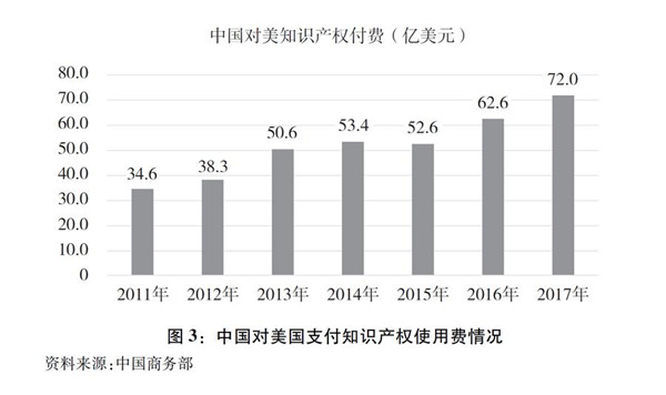 中国对美国支付知识产权使用费持续增加。据中国有关方面统计,美国是中国大版权引进来源国,2012-2016年,中国自美国引进版权近2.8万项。中国对美国支付的知识产权使用费从2011年的34.6亿美元增加至2017年的72亿美元,6年时间翻了一番(图3)。其中2017年中国对美支付占中国对外支付知识产权使用费总额的四分之一。