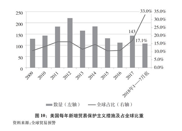 美国贸易保护主义措施增多,在全球占比不断提高。全球贸易预警(Global Trade Alert)统计数据显示,2017年,全球共有837项新的保护主义干预措施,其中美国出台143项措施,占全球总数的17.1%。2018年1-7月底,美国出台的保护主义措施占全球比重达到33%(图10)。