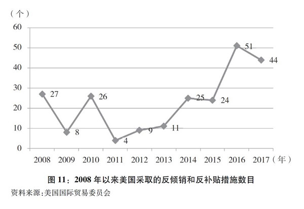 美国国际贸易委员会的统计数据显示,截至2018年7月17日,美国仍在生效的反倾销和反补贴措施共有44项(图11),其中58%是2008年金融危机以来新采取的“双反”措施,主要针对中国、欧盟和日本。