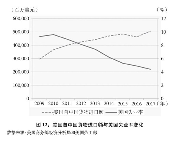 美国将国内政策失误和制度缺陷导致的失业问题错误归因于国际贸易。美国政府认为他国通过不公平贸易的方式抢夺了本国就业岗位,作为美国贸易逆差大来源国,中国首当其冲成为主要的被指责对象。事实是,根据联合国数据,2001-2017年,中美贸易额增长了4.4倍,但美国失业率则从5.7%下降到4.1%。尤其是2009年以来,美国从中国进口快速增长,同期美国失业率反而呈现出持续下降的态势,美国政府指责的货物进口和失业率之间的替代关系并不存在(图12)。2017年美国国会研究中心报告显示,2010-2015年,尽管美国制造业从中国进口整体增加32.4%,美国制造业的工作机会反而增加了6.8%。