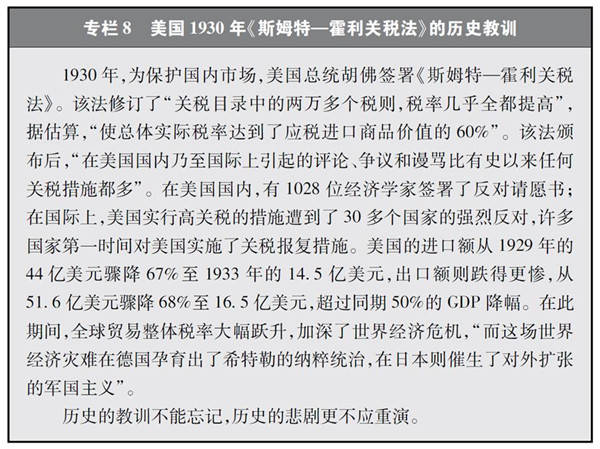 世界银行2018年6月5日发布的《全球经济展望》报告指出,全球关税广泛上升将会给全球贸易带来重大负面影响,至2020年全球贸易额下降可达9%,对新兴市场和发展中经济体的影响尤为明显,特别是那些与美国贸易或金融市场关联度较高的经济体(图14)。世界贸易组织总干事罗伯特•阿泽维多表示,若关税回到关税总协定/世界贸易组织之前的水平,全球经济将立即收缩2.5%,全球贸易量削减60%以上,影响将超过2008年国际金融危机。贸易战对所有人都有害,特别是穷人将损失63%的购买力。历史教训一再表明,贸易战没有赢家,甚至会给世界和平和发展带来严重影响(专栏8)。