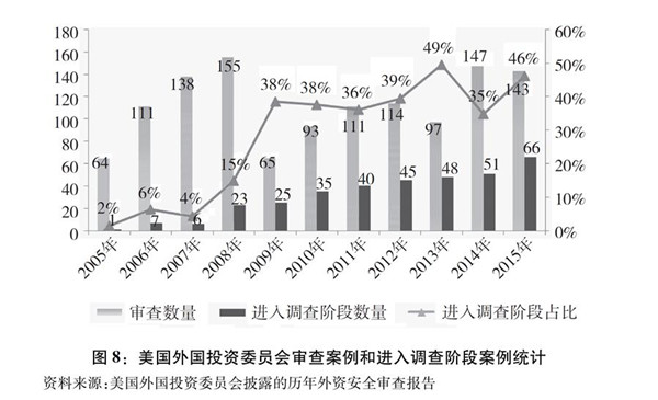 在外商投资安全审查实践中,美国“国家安全审查”的依据模糊不清,审查力度不断加大。根据美国外国投资委员会的历年外资安全审查报告,2005-2008年审查外国投资交易案例468起,其中需要进入调查阶段的案例37起,占比仅8%。但自2008年美国财政部发布《外国人合并、收购和接管规制:终规则》以后,2009-2015年期间审查的770起案例中,需要进入调查阶段的达到310起,占比陡然提高到40%。尤其是在新披露的2015年数据中,这一比例进一步提高到46%,处于较高水平(图8)。