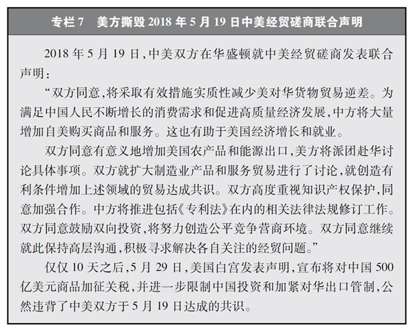 美国政府在双边经贸谈判中出尔反尔,不守承诺。中国历来高度重视维护中美关系稳定,特别是2017年以来,积极回应美国经贸关切,以极大的诚意和耐心与美国政府开展了多轮磋商,力图弥合分歧、解决问题。2018年2月下旬到3月上旬,应美国方面强烈要求,中国派团赴美举行经贸谈判。4月3日,美国公布对500亿美元中国输美产品加征25%关税的产品清单。面对美国反复无常、不断抬高要价的行为,中国本着大限度通过对话解决问题的诚意,于5月初与来华谈判的美国代表进行了认真磋商。5月15日至19日,中国应美国要求再次派代表团赴美谈判,并在谈判中对美国诉求做了积极回应。双方在付出艰辛努力后,达成“双方不打贸易战”的共识,并于5月19日对外发表了联合声明。但是,仅仅10天之后,美国政府就公然撕毁双方刚刚达成的联合声明,背弃不打贸易战的承诺,越过世界贸易组织争端解决机制,宣布将对来自中国的产品实施大规模征税措施,单方面挑起贸易战(专栏7)。