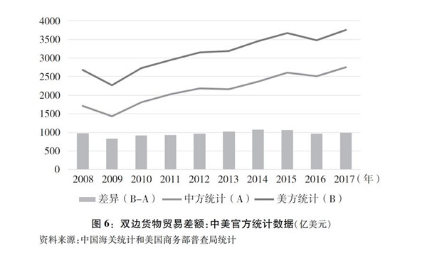 此外,美国统计方法相对高估了中美货物贸易逆差额。中美双方的统计差异长期存在,且差异较大。2017年,中国统计对美货物贸易顺差为2758亿美元,美国统计对华逆差接近3958亿美元,相差1000亿美元左右。由中美两国商务部相关专家组成的统计工作组,每年就中美贸易统计差异进行一次比较研究。根据该工作组测算,美国官方统计的对华贸易逆差每年都被高估20%左右。根据中国海关和美国商务部普查局的统计,双方统计结果在近十年来的走势和变动幅度大致相同(图6)。引起差异的原因包括进口价格和出口价格之间的差异、转口贸易增值、直接贸易加价、地理辖区、运输时滞等。