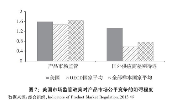美国产品市场的公平竞争环境不如多数发达国家,甚至逊于一些发展中国家。根据经合组织发布的2013年“产品市场监管指标”对35个经合组织国家进行排名,前3位是荷兰、英国和澳大利亚。美国只排在第27位,反映出美国市场监管政策对产品市场公平竞争存在较多障碍。而在加入12个非经合组织国家的指标后,美国在47个国家中仅列第30位,其产品市场公平竞争环境不及立陶宛、保加利亚和马耳他等非经合组织国家。