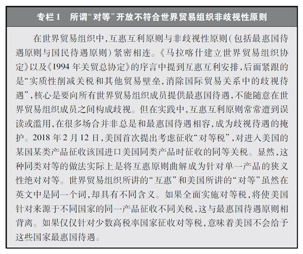 世界贸易组织所提倡的互惠互利原则,考虑了各国发展阶段的差别。在世界贸易组织框架下,发展中成员享有差别和更优惠待遇。这种制度安排是在尊重发展中国家和地区发展权的基础上,积极吸纳新的发展中成员加入,以扩大成员数量、增强多边体制的包容性,也体现了以当期优惠换取后期开放的互惠原则。对于发展中成员而言,由于其处于发展初期阶段,需要对产业适度保护以促进良性发展,其市场随经济发展扩大后,也将为发达国家带来更多商业机会。发展中成员享有差别和更优惠待遇,符合包括发达成员在内的各国各地区长期利益,这种制度安排是真正意义上的国际公平。2001年,中国通过多边谈判以发展中成员身份加入世界贸易组织,享受发展中成员待遇。十几年来,中国经济实现了快速发展,但仍然是一个发展中国家。由于中国有13.9亿人口,经济总量数据显得较为庞大,但这没有改变人均发展水平较低的现实。根据国际货币基金组织数据,2017年中国人均国内生产总值8643美元,仅为美国的14.5%,排在世界第71位。2017年末中国还有3046万农村贫困人口。仅以中国经济和贸易总规模较大为依据,要求中国和美国实现关税绝对对等是不合理的。美国追求绝对对等的做法,违背了世界贸易组织惠国待遇和非歧视性原则(专栏1)。
