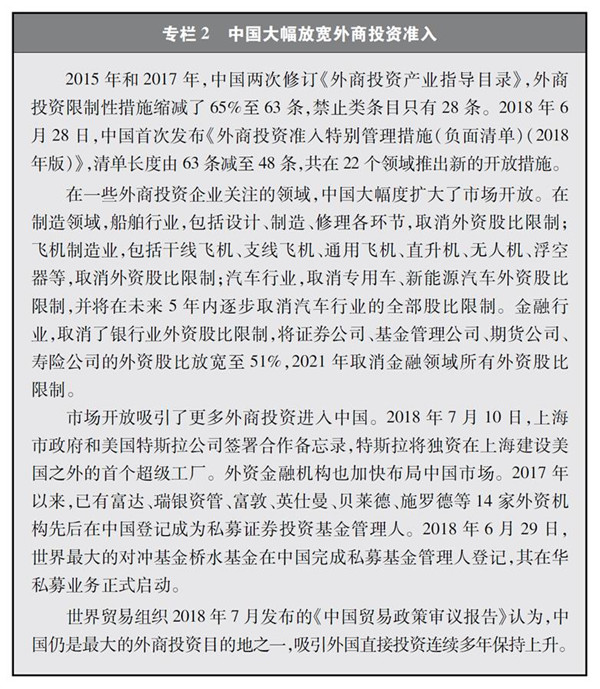 除此之外,中国在某些领域的股权合作符合中国的国际义务、各国惯例和实践,不能被混淆为“强制技术转让”。而且,近几年中国对外商投资的股权限制不断放开,外国企业自由选择权不断扩大(专栏2)。在此过程中,中外企业股权合作仍然不断深化,完全是双方基于商业原因的自由选择。