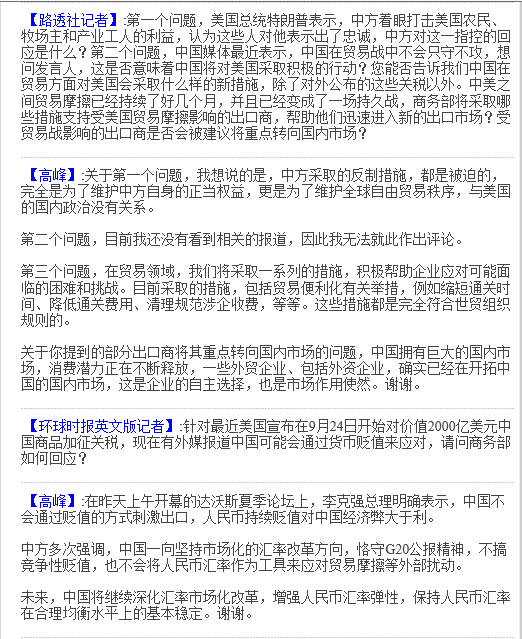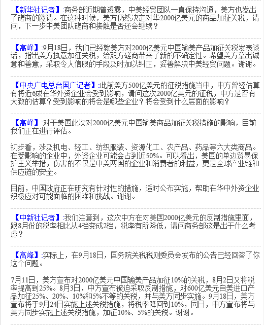 中国商务部新闻发言人高峰20日称,美国对2000亿美元中国商品加征关税措施涉及机电、轻工、纺织服装、药品等六大品类,在受影响企业中,外企占比50%。美方此举伤害的不仅是中美两国企业和消费者利益,还伤害全球产业链安全。目前中国正在研究有针对性的措施帮助企业应对可能的困难。