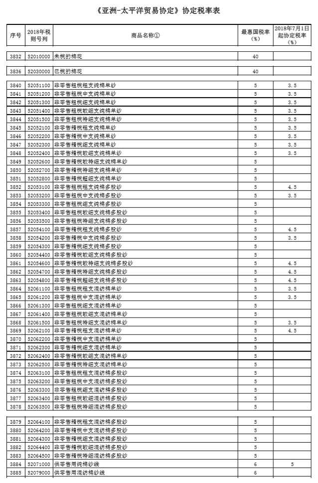 根据《中华人民共和国进出口关税条例》及经国务院核准的《〈亚洲-太平洋贸易协定〉第二修正案》,决定自2018年7月1日起,对原产于孟加拉国、印度、老挝、韩国、斯里兰卡的进口货物适用《〈亚洲-太平洋贸易协定〉第二修正案》协定税率。具体税目税率见附件。