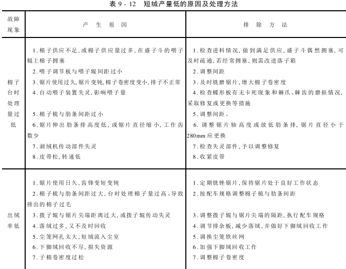 短绒质量差、产量低的原因及处理方法见表9-11和表9-12。