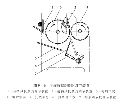 排杂调节板、托绒板也是与毛刷滚筒同心的圆弧板。排杂调节板可前后、上下移动,以便调节排杂量。