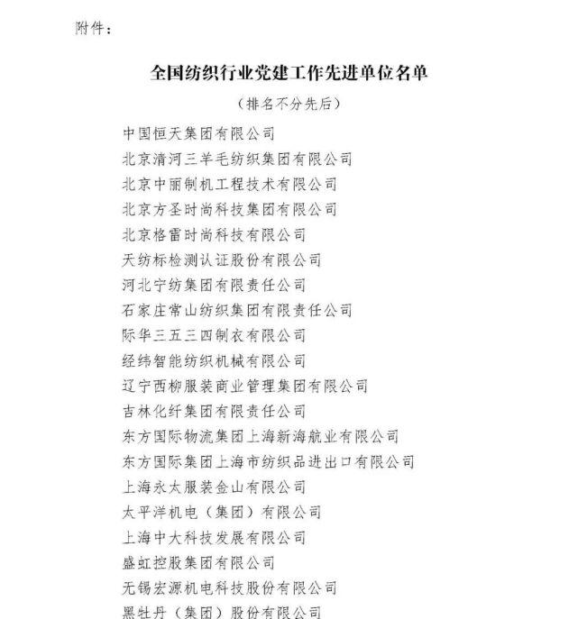 为树立典型,鼓励先进,推动纺织行业党建标准化工作不断深化提升,促进纺织强国建设再出发,中国纺织工业联合会决定命名中国恒天集团有限公司等73家单位为“全国纺织行业党建工作先进单位”。