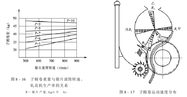 子棉卷的运动速度与锯片滚筒转速、轧花机生产率之间的关系,如图8-18所示。在生产率相同的条件下,提高锯片滚筒转速,会使子棉卷变松,运动速度降低;在锯片滚筒转速相同的条件下,提高轧花机生产率,会使子棉卷变紧,运动速度加快。
