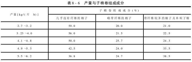 单粒子棉上的纤维经过一次锯齿勾拉肯定不能拉完,即单粒子棉的轧剥过程都是在一定时间间隔内完成的,故工作箱内的子棉卷由处于不同轧剥阶段的单粒子棉组成。但子棉卷的组成也不是固定不变的,处于不同轧剥阶段的子棉群比例与轧花机的操作过程(特别是喂花速度)有关。改变喂花速度会改变子棉卷组成成分的比例及其他参数,如子棉卷转速、子棉卷重量、子棉卷密度等。从表8-6可以看出:子棉卷中轧净纤维的棉子数量,随轧花机生产率的提高有规律地减少;单粒子棉和带纤维多的棉子,则随轧花机生产率的提高增加了。另外工作箱内还存在着大量完全轧剥过的,应该从工作箱内排出的棉子。这些棉子滞留在工作箱内,无疑会降低轧花机的生产率。为此,有一种理论认为:减少棉子在工作箱内的逗留时间,是提高轧花机生产率的重要途径。