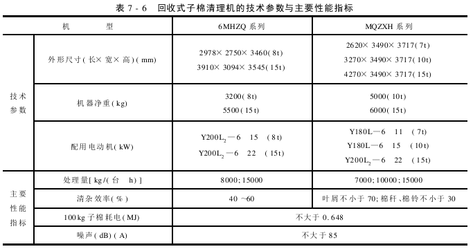 6MZQ系列和MQZX系列倾斜式子棉清理机的技术特性见表7-4。