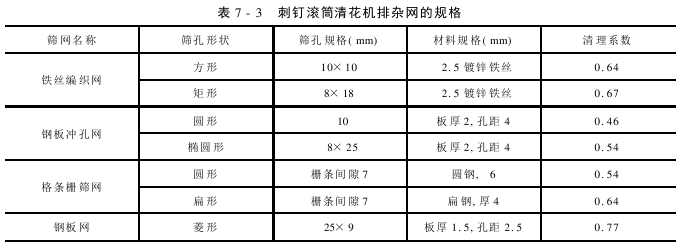 (4)筛网的结构形式及其清洁程度:刺钉滚筒清花机的排杂网有铁丝编织网、钢板冲孔网、格条栅筛网和钢板网等类型。除杂筛网的清杂效率与筛孔的有效面积、筛孔的排列、筛孔的形状及筛网表面积等有关。