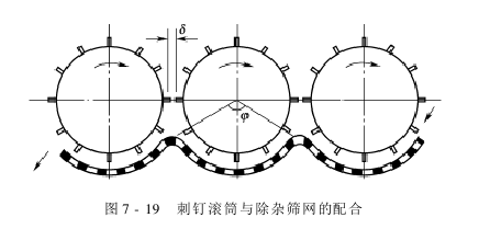 除杂筛网应与刺钉滚筒相配合,其形状一般呈圆弧形。除杂筛网的圆弧对应于刺钉滚筒的中心角φ(图7-19),这是一个比较重要的参数。其数值过大,子棉易随刺钉返回而造成重复打击,产生棉结、索丝等疵点;反之,除杂筛网之间不可避免地出现直线连接段,子棉易在此处停留,引起堵塞,其次,还减少了刺钉与除杂筛网的配合作用范围,影响清杂效率。一般φ应控制在110°~115°。