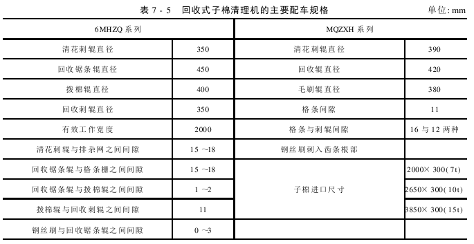 6MHZQ系列和MQZXH系列回收式子棉清理机的技术特性见表7-5和表7-6。