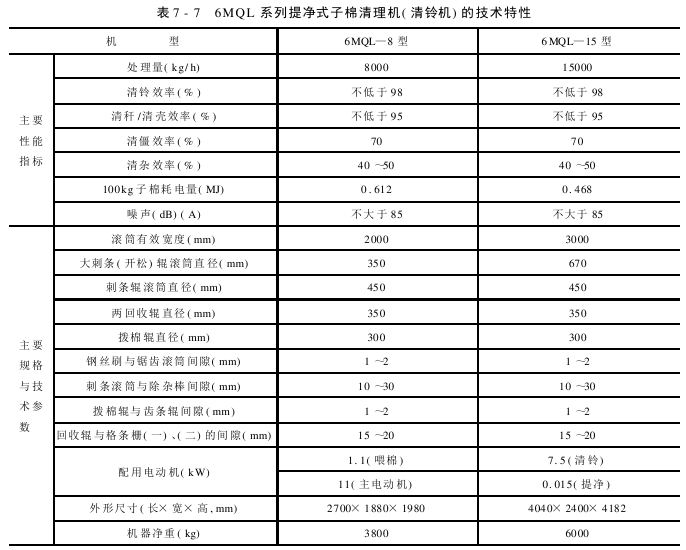 6MQL系列提净式子棉清理机的技术特性见表7-7所示。