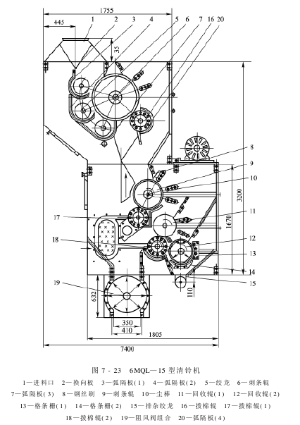 6MQL—15型清铃机如图7-23所示。清铃部由刺条辊、换向板、排杂绞龙、拨棉辊、钢丝刷、弧隔板、尘棒、溜杂板及机架组合而成。提净部由刺条辊、钢丝刷、除尘棒、回收辊(1)、回收辊(2)、拨棉辊(1)、拨棉辊(2)、格条栅(1)、格条栅(2)、排杂绞龙等部件组成。传动系统由2台电动机带动。7.5kW电动机带动清铃部各辊及各绞龙,15kW电动机带动提净部各辊及阻风阀及排杂绞龙。