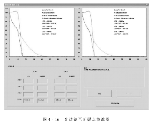 (2)光透镜至断裂点校准:光透镜至断裂点校准用来检查并更新光透镜到夹钳之间距离的精确性。光透镜至断裂点校准菜单如图4-16所示。屏幕上的两个图代表了左边和右边的梳齿。