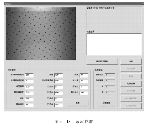 在校准菜单上(图4-18),点击杂质校准,开始测试。按下开始按钮,屏幕右上方的信息显示了开始校准的说明。首先在颜色窗口放入白板(光面向下)。在窗口提示时放入有标准参数的杂质板(板上的标准参数应当与输入的数值相符),点击开始。再次放白板(测试面积),再点开始。校准完成后,测试值在允差范围内时,点击保存按钮。