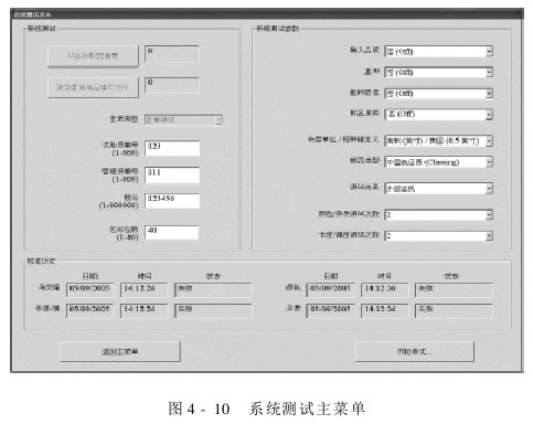 系统测试主菜单(图4-10)可以选择或者输入以下系统测试参数:试验员编号、管理员编号、批号、包号位数。也能重新设置样品计数清零、清空重测样品编号文件。可以选择输入状态参数选项:等级、重测、批样限值、样品废弃、长度单位/短纤维定义、棉花类型、测试结果、颜色/杂质测试次数、长度/强度测试次数。