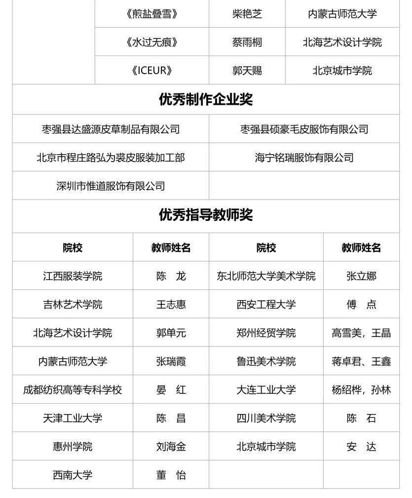 尤其值得一提的是,枣强县达盛源皮草制品有限公司、枣强县硕豪毛皮服饰有限公司、北京市程庄路弘为裘皮服装加工部、海宁铭瑞服饰有限公司、深圳市惟道服饰有限公司等5家优秀企业为本届大赛服装组入围选手提供了制作服务,被授予2021“裘都杯”中国裘皮服装服饰创意设计大赛优秀制作企业奖,江西服装学院陈龙等15位老师被授予优秀指导教师奖。