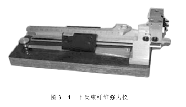 断裂应力是各种材料通用的可比性强度指标,单位为MPa。由于纤维的截面积很难测得,故生产上不采用这一指标。棉纤维的断裂应力在商业上常用磅力/平方英寸或千磅力/平方英寸等单位表示,它是根据卜氏强力机的一个专用强度指标———卜氏指数(磅力/mg)求得的,在国际棉花贸易交往中应用得比较广泛。卜氏束纤维强力仪如图3-4所示。