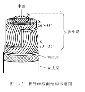 棉纤维的横截面由许多同心层组成,主要有初生层、次生层、中腔三个部分,如图1-3所示。