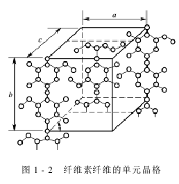 纤维中大分子的排列比较复杂。纤维内某些区域由于大分子的侧吸引力而排列得比较整齐、密实,缝隙、孔洞较少,这称为结晶区。相反,另一些区域大分子排列比较紊乱,堆砌比较疏松,其中有较多的缝隙和孔洞,密度较低,这称为非结晶区。因此,棉纤维微观内部是一种多孔性的结构,并同时存在着结晶区和非结晶区。结晶部分占整根纤维的百分比称为结晶度。棉纤维的结晶度约为70%,其结晶结构的小单元,即单元晶格(或称晶胞)是由五个平行排列的纤维素大分子在两个氧六环链节长的一段上组成,中间的一个大分子与棱边的 四个大分子是倒向的。其晶胞属单斜晶系,如图1-2所示。不同种类的纤维素纤维,其晶胞尺寸是不相同的。棉纤维和麻纤维单元晶格的a=0.835nm,b=1103nm,c=0.795nm,β=84°,称为纤维素Ⅰ晶胞。粘胶纤维及丝光处理后的棉纤维其单元晶格的a=01814nm,b=1.03nm,c=0.914nm,β=62°,称为纤维素Ⅱ晶胞。
