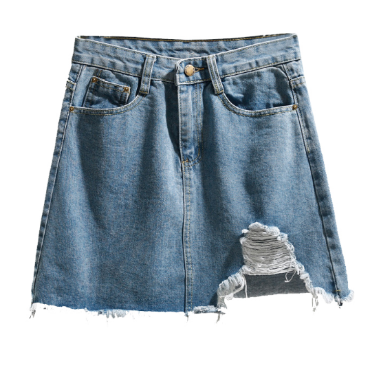 很走心的一款牛仔半身裙,个性随意,经典耐看,版型采用了时髦A字型,很清新活泼的一款,裙摆做了磨毛破洞效果和不规则的造型,既显档次又减龄,穿上感觉气场一下子就出来了,很有时尚范。