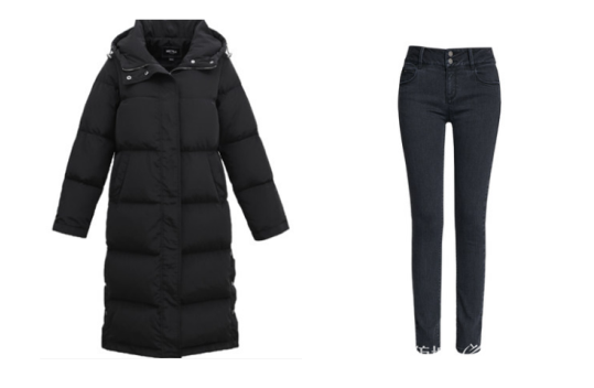 羽绒服的设计偏蓬松,搭配紧身裤特别是黑色的视觉收缩性,适当减轻羽绒服的伸缩性,像这样搭配同色系的紧身裤,显瘦又显高。