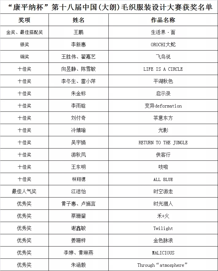 “康平纳杯”第十八届中国(大朗)毛织服装设计大赛总决赛已完美收官,大赛组委会将继续以发掘和培养优秀毛织设计师为使命,为新生代设计师们打造更优质的发展平台,为行业输送优秀设计人才,提升中国毛织行业的产业格局,也希望未来会有越来越多的新生代设计力量能够在大赛平台上大放异彩。