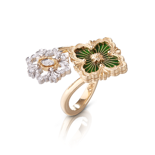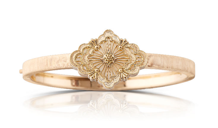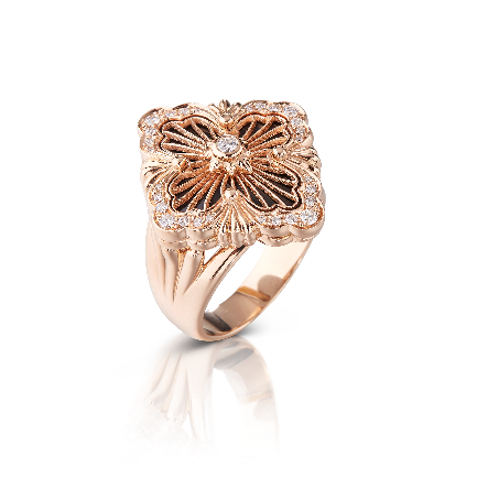 Opera Tulle保持了布契拉提珠宝特有的奢华与柔美,其花卉图案来源于布契拉提的品牌标识,以文艺复兴时期的意大利建筑为灵感,设计分别借鉴了罗马四喷泉圣卡罗教堂穹顶的轮廓、布斯卡的城堡主入口上方的玫瑰花窗、以及威尼斯总督宫柱顶的装饰图案。