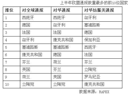今年上半年对华发出通报多的依然是西班牙,达110起(去年全年的通报数是172起)。匈牙利、法国、捷克共和国、塞浦路斯分别排名前5位。对华发出通报数多的10个国家共发出551起通报,占全部对华通报总数的82.2%。