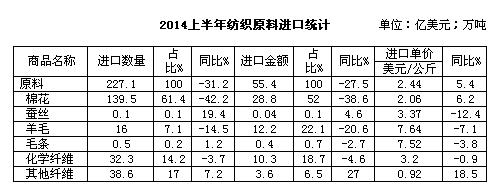 据中国海关统计,2014年上半年我国纺织原料进口量减价增,进口总量227.1万吨,同比下滑31.2%,主要是由于棉花进口量下滑了42.2%;进口均价上涨5.4%,为2.44美元/公斤,除棉花及其他纤维价格有上涨,其他原料价格均下滑;原料进口总额55.4亿美元,同比下滑27.5%。