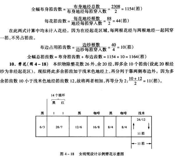 8.全幅花数与总经根数 确定每箱经纱穿入数:布身地经为2入,布身经起花区域为4入(2根地经、2根花经共穿一筘),布边区域为4入。