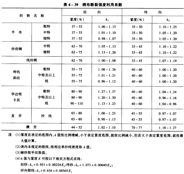 棉布经向或纬向断裂强度是指试样布条尺寸为5cm×20cm的断裂强度。经纱或纬纱密度是每10cm内的经纱或纬纱根数。断裂强度利用系数根据织物组织而定,其数值见表