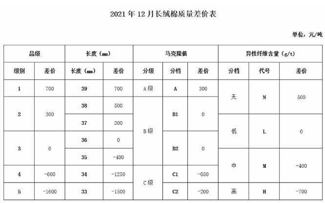 根据《中国棉花协会国产棉质量差价表管理办法》规定,现正式发布2021年12月《锯齿加工细绒棉质量差价表》、《皮辊加工细绒棉质量差价表》和《长绒棉质量差价表》(单位:元/吨)。