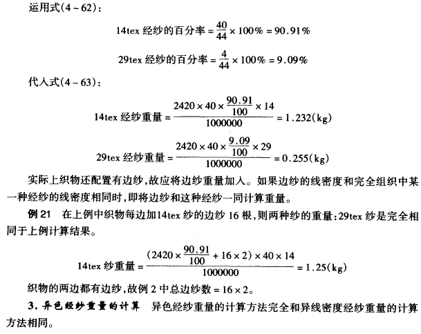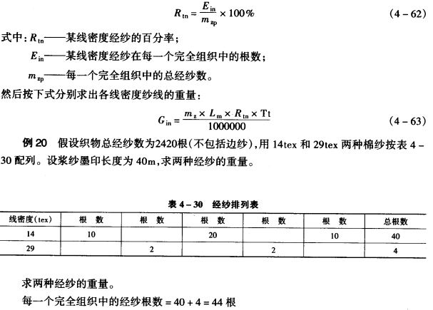 方法二:凡用几种不同线密度的纱线组成经纱时,而各种纱支的配列呈有规律的循环时,均可用本法计算各种经纱重量。这种有规律的每一循环,在织物设计上称为一个“完全组织”。例1中表4—29列出的数字是某种织物一个完全组织内异线密度经纱配列的情况,每44根经纱组成一个完全组织。