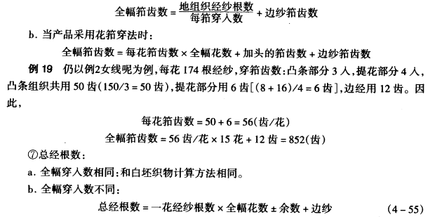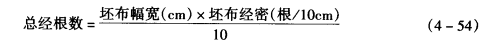 (1)白坯织物:全幅织物中总经纱根数是根据经纱密度、幅宽和边纱根数来决定的。当织物中地经和边经均匀地穿入筘齿时,总经纱根数M总可按下式计算: