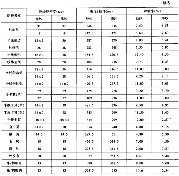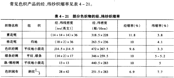 本色棉布各种织物的经、纬纱织缩率见表4—20。