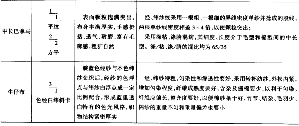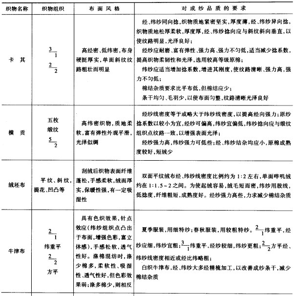 任何织物的物理机械特性,都是根据其使用要求提出的,而织物的一切物理机械特性,均与织物组织和构成织物的经、纬纱线的品质等因素有关。现将主要几种织物的名称、织物组织、布面风格及对成纱品质的要求列于表4—14。