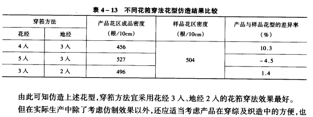 (4)综合调整法:当产品与样品的经、纬密度均有很大差异酌情况下,在仿祥时综合运用调整穿箱法和调整花经法来保持样品花型的宽度,用改变花经组织点的方法来保持样品花型的长度,这种仿制花型的方法简称综合调整法。