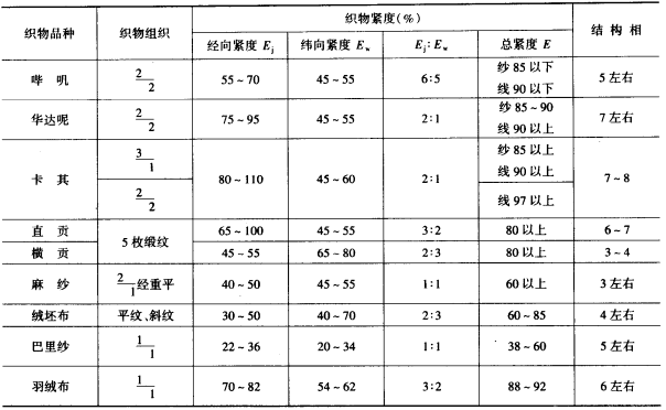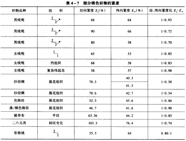 棉织物的紧度范围比较宽广,从紧度很小的巴里纱到紧度特大的卡其等。经、纬密度比的差异也很大。常见本色织物的一般紧度范围见表4—6,部分色织物的紧度见表4—7。