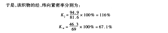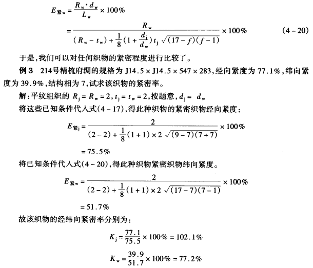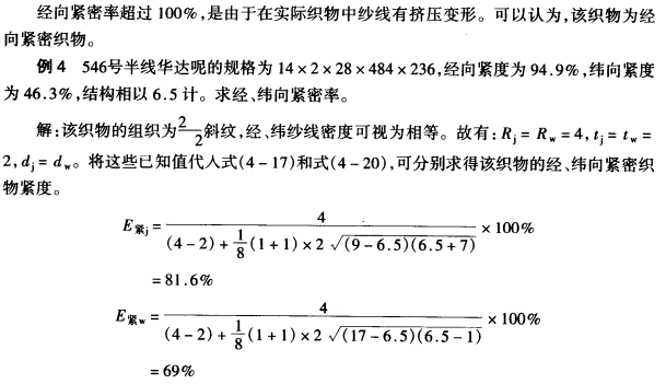 比较例1与例4还可以看出,即使是相同的经纬纱线密度、相同组织的织物,当结构相不同时,其紧密织物的紧度(经向与纬向)是不相同的,即织物的可密性是不同的。